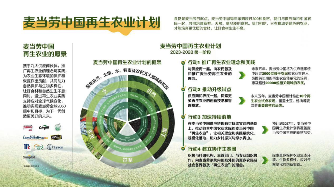 2023年3月4日,麦当劳启动了“再生农业”计划,从自然、土壤、水、牲畜及农民五个领域切入,实现再生农业理念和实践的系统化、规模化推广和落地,并且通过再生农业实践支持应对全球气候变化,推动实现麦当劳全球2050碳中和目标,助力绿色低碳农业加速发展。